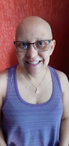 Ao notar esse “caroço” agendei uma consulta com o médico, que me encaminhou para realizar diversos exames. Nesse momento comecei a me preocupar, porque não acreditava que poderia ser um câncer. E então veio a confirmação. Não tem jeito, é como todos dizem, um choque. Mas reagi bem. Segui as orientações, iniciei meu tratamento no IC e logo na primeira quimioterapia meu cabelo caiu muito e então resolvi assumir a careca. Sem lenço, sem peruca, mostrar a Roberta do momento.